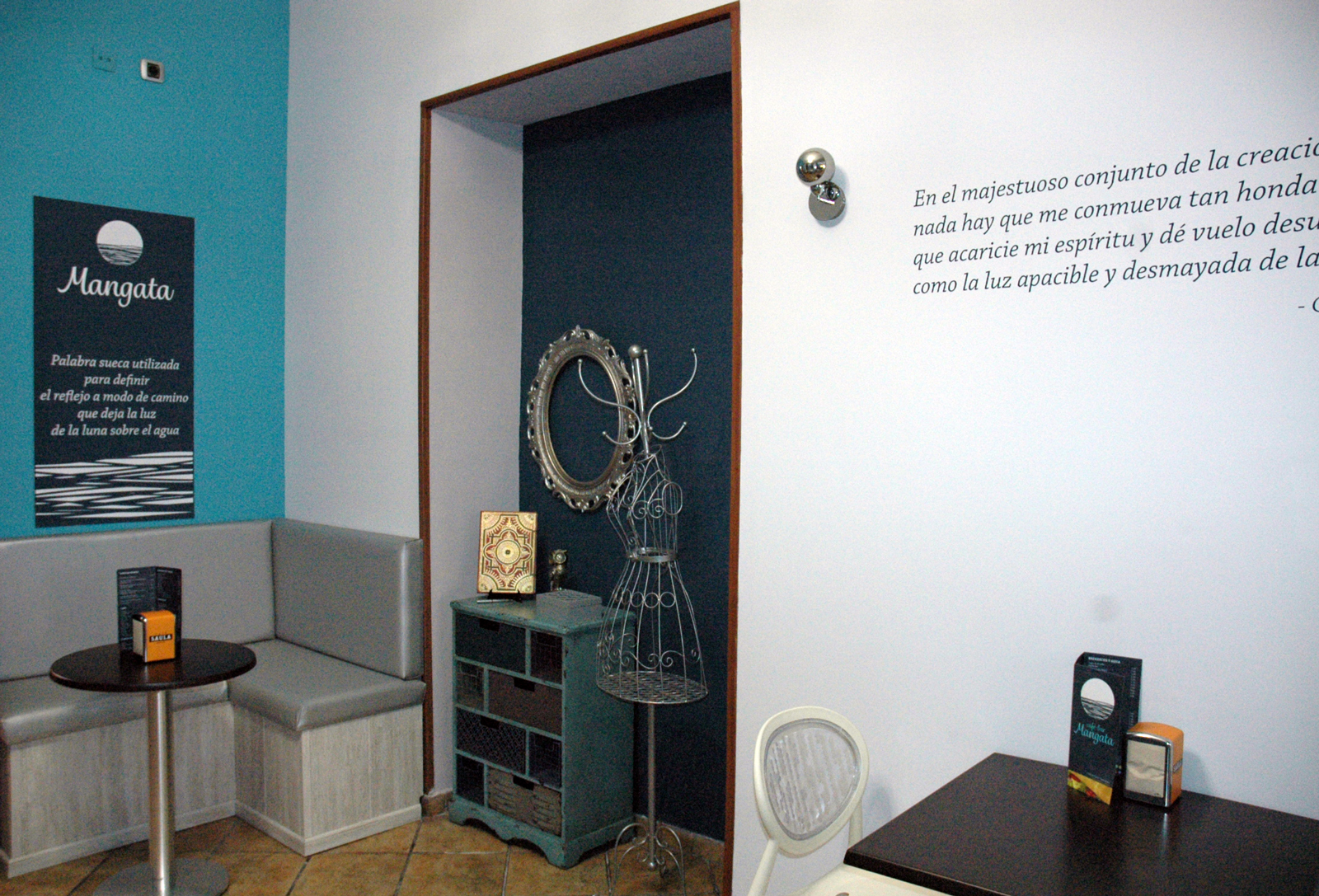Cuidadosamente decorado, han tenido presente cada detalle, acogedores rincones y una terraza trasera muy agradable para pasar un buen rato con amigos o pareja mientras tomas un buen vino o pruebas algunas de sus especialidades, rodeado de obras de arte y cosas curiosas.