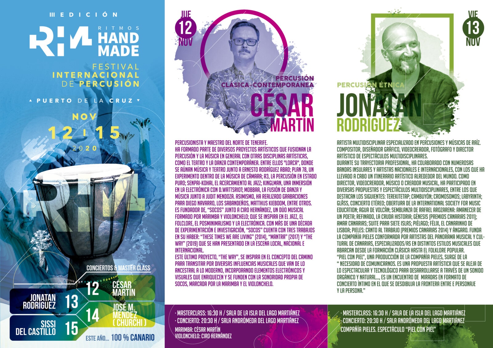 Llega el III Festival Internacional de Percusión Ritmos Handmade en una edición 100% canaria, que pone en valor el apoyo al sector cultural y el reconocimiento del talento musical y artístico local. Se desarrollará en la ciudad de Puerto de la Cruz del 12 al 15 de noviembre de 2020.