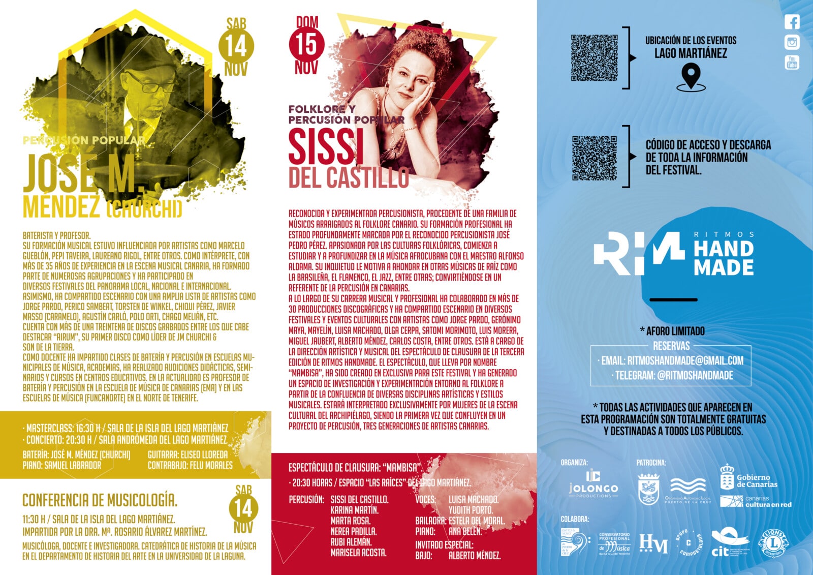 La tercera edición del Festival Internacional de Percusión Ritmos Handmade tendrá lugar en las instalaciones del Lago Martiánez de Puerto de la Cruz y contará con la participación de reconocidos/as percusionistas de la escena cultural canaria en un programa de actividades, totalmente gratuito y destinado a todos los públicos, que comprende conferencias, espectáculos, masterclass y conciertos.